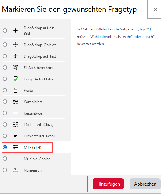 Sie können aus verschiedenen Fragetypen auswählen, beispielsweise Antwort-Wahl-Aufgaben vom Typ MTF oder Lücketextauswahl. Weitere gängige Typen sind z.B. Numerisch, Kurzantwort oder Freitext. Eine automatische Auswertung ist abhängig vom Typ möglich.