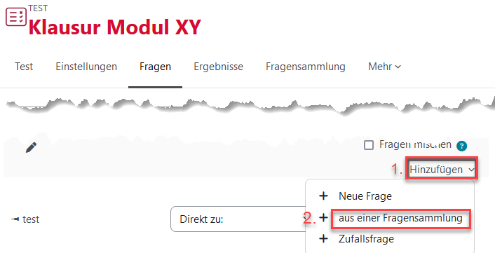 Nachdem Sie Fragen in eine Fragensammlung eingefügt haben, können Sie diese in einen Test einfügen. Erstellen Sie dazu einen neuen Moodle Test oder öffnen Sie in einem bestehenden Test den Menüpunkt „Fragen > Hinzufügen > + aus Fragensammlung“ (vgl. Tutorial zur Erstellung einer E-Klausur mit der Moodle Test-Aktivität).