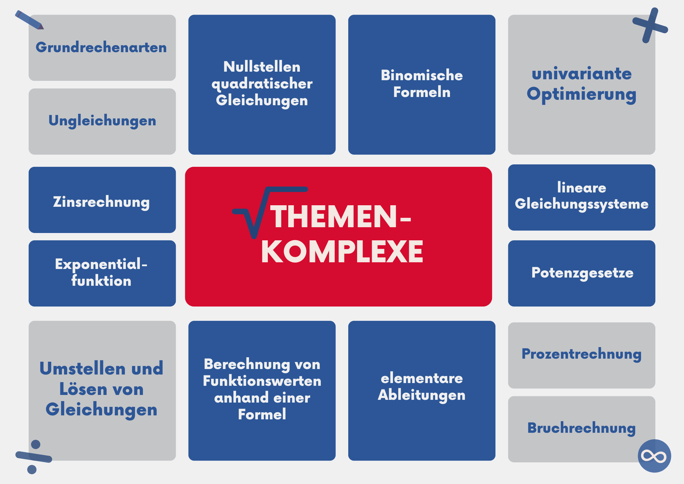 Die Themenkomplexe sind so angeordnet, dass der Mathematik-Test mit sehr einfachen Aufgaben startet. Während der Bearbeitung können die Studierenden Aufgaben überspringen und anschließend wieder zurückgehen. Als Hilfestellung ist der Themenkomplex jeder Aufgabe anhand der Überschrift klar erkennbar, sodass Studierende bei der Reihenfolge der Bearbeitung strategisch vorgehen können.