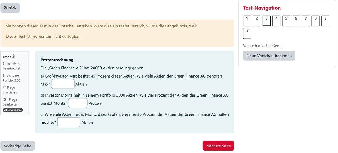 Der Moodle-Test besteht aus 10 Themenkomplexen aus dem Schulwissen a 3 Minuten Bearbeitungszeit, sodass die reine Testdauer insgesamt 30 Minuten beträgt. Die Aufgaben innerhalb der Themenkomplexe werden randomisiert gezogen, sodass alle Studierenden einen individuellen Test absolvieren und „Abschreiben“ nicht zielführend ist. Es gibt Felder zum Eintragen von Rechenergebnissen sowie ggf. Multiple-Choice-Aufgaben. Alle Aufgaben sind so konzipiert, dass ein Taschenrechner nicht erforderlich ist. Erlaubte Hilfsmittel sind nur Papier und Stift.